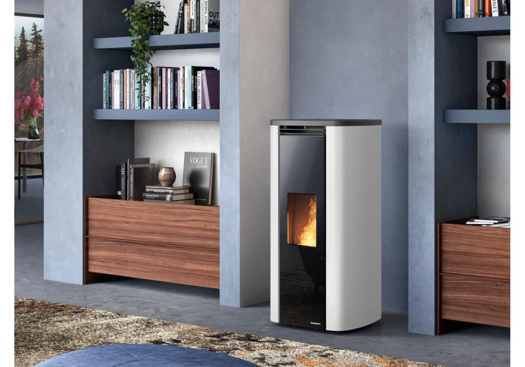 Élégant poêle à granulés étanche aux formes douces, avec un dessus en fonte et une porte en verre sérigraphié.